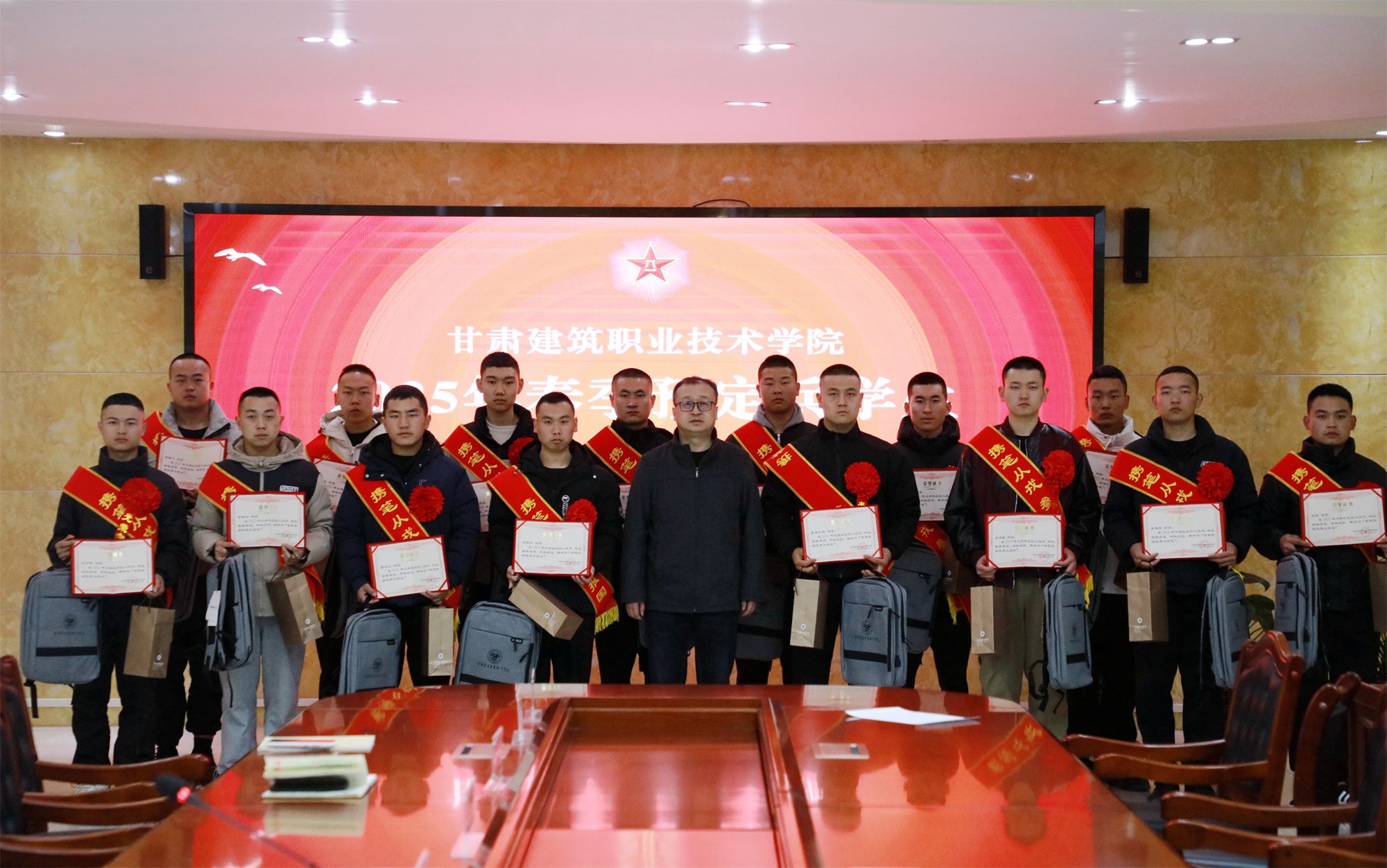 会上,高忠有代表学校向光荣入伍的学子表示热烈祝贺,充分肯定他们“将个人理想融入强军梦”的家国情怀。他指出,学校历来高度重视大学生入伍工作,2017年以来学校向部队输送优秀学子1500多人,连续3年获评“甘肃省征兵工作先进单位”,多次荣获市、区级“征兵工作先进单位”。尤其自2023年突出毕业生征集以来,学院已向部队输送优秀毕业生近280人,2025年春季毕业生报名460余名,这份成绩凝聚着师生的共同奋斗,更彰显了建院学子“携笔从戎、报效祖国”的精神传承,学校将持续做好入伍学生的学籍保留、学费补偿代偿等相关工作。