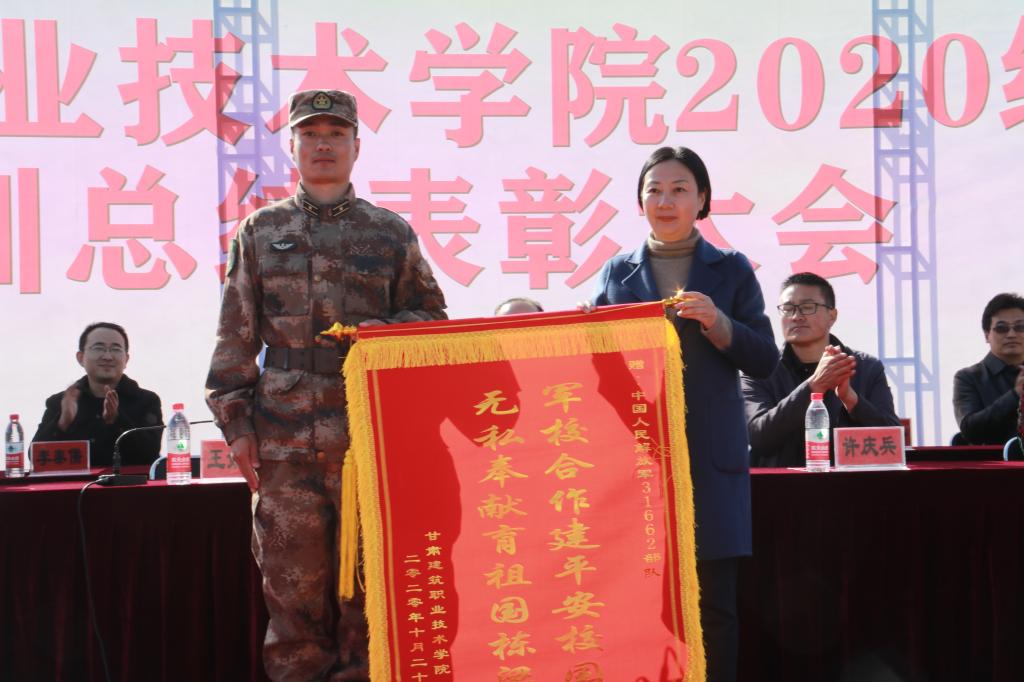 军训成果总结结束后,学院党委委员、副院长李君宏同志宣读了《甘肃建筑职业技术学院关于表彰2020级学生军训先进集体及先进个人的决定》;主席台领导为获奖集体和个人颁发了荣誉证书与奖品,学院党委书记、院长王娟丽代表学院向中国人民解放军赠送了“军校合作建平安校园,无私奉献育祖国栋梁”的锦旗。随后,2020级参训学生代表桂荣强作了热情洋溢的发言,分享了自己的军训中的感受与收获,号召同学们在未来的学习生活中保持军训中养成的良好习惯,争做优秀建院人。军训团团长薛东在发言讲话指出,学生们听从指挥,努力拼搏,克服困难,严格要求自己,严守军训纪律,以最佳的精神状态圆满完成了此次军训任务,感谢学院领导对部队的关心。