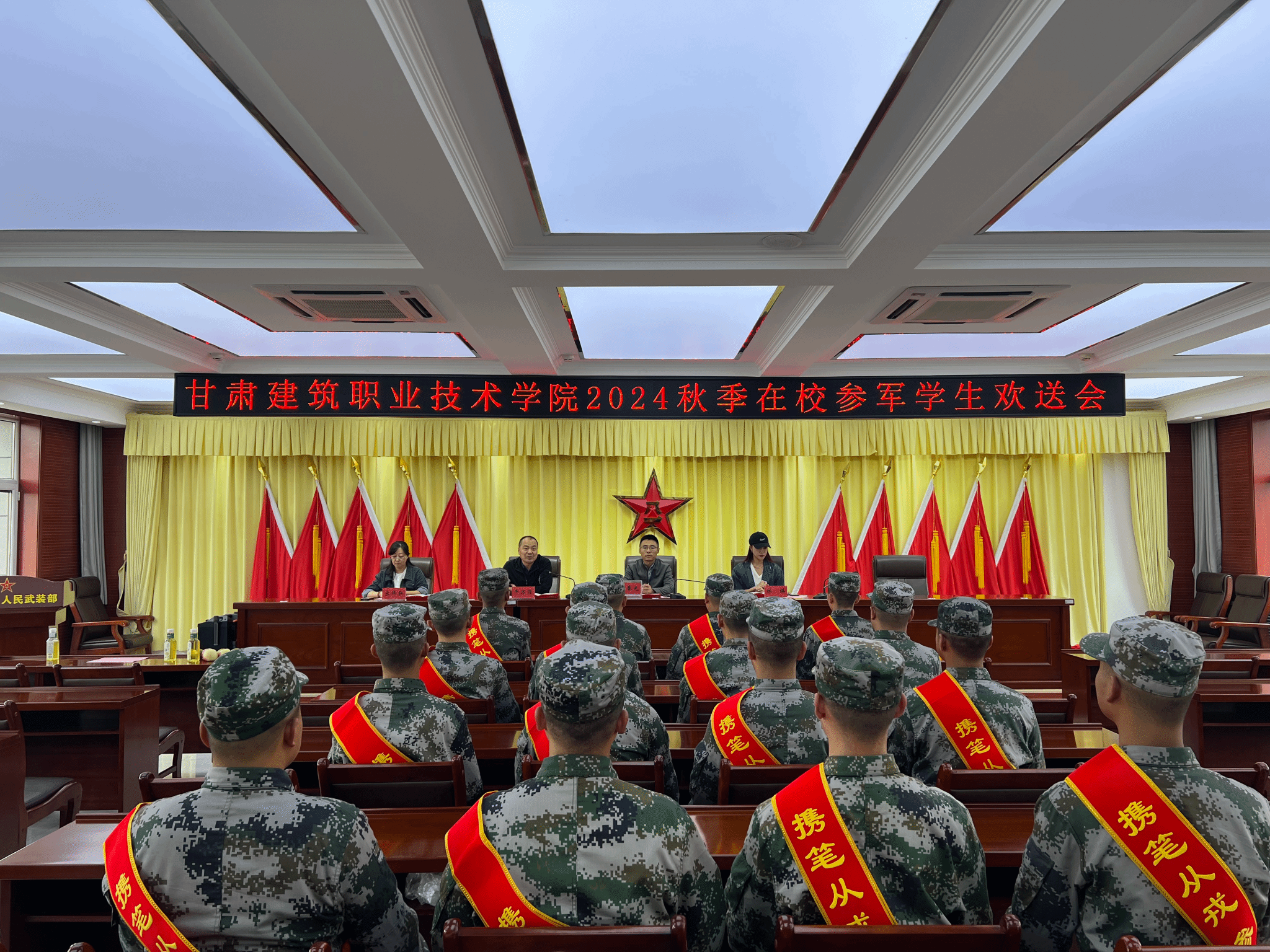9月13日下午,学院2024秋季在校应征入伍大学生欢送会在七里河区人武部召开,学院学生工作处副处长牛万强,交通工程学院党总支书记居春光,建筑经济管理学院辅导员林瑛、学生工作处宋炜弘参会,会议由牛万强主持。