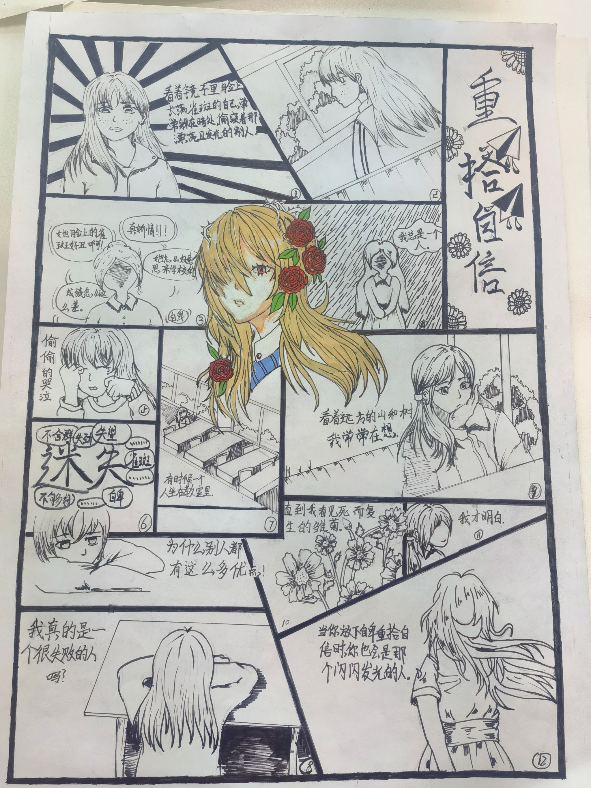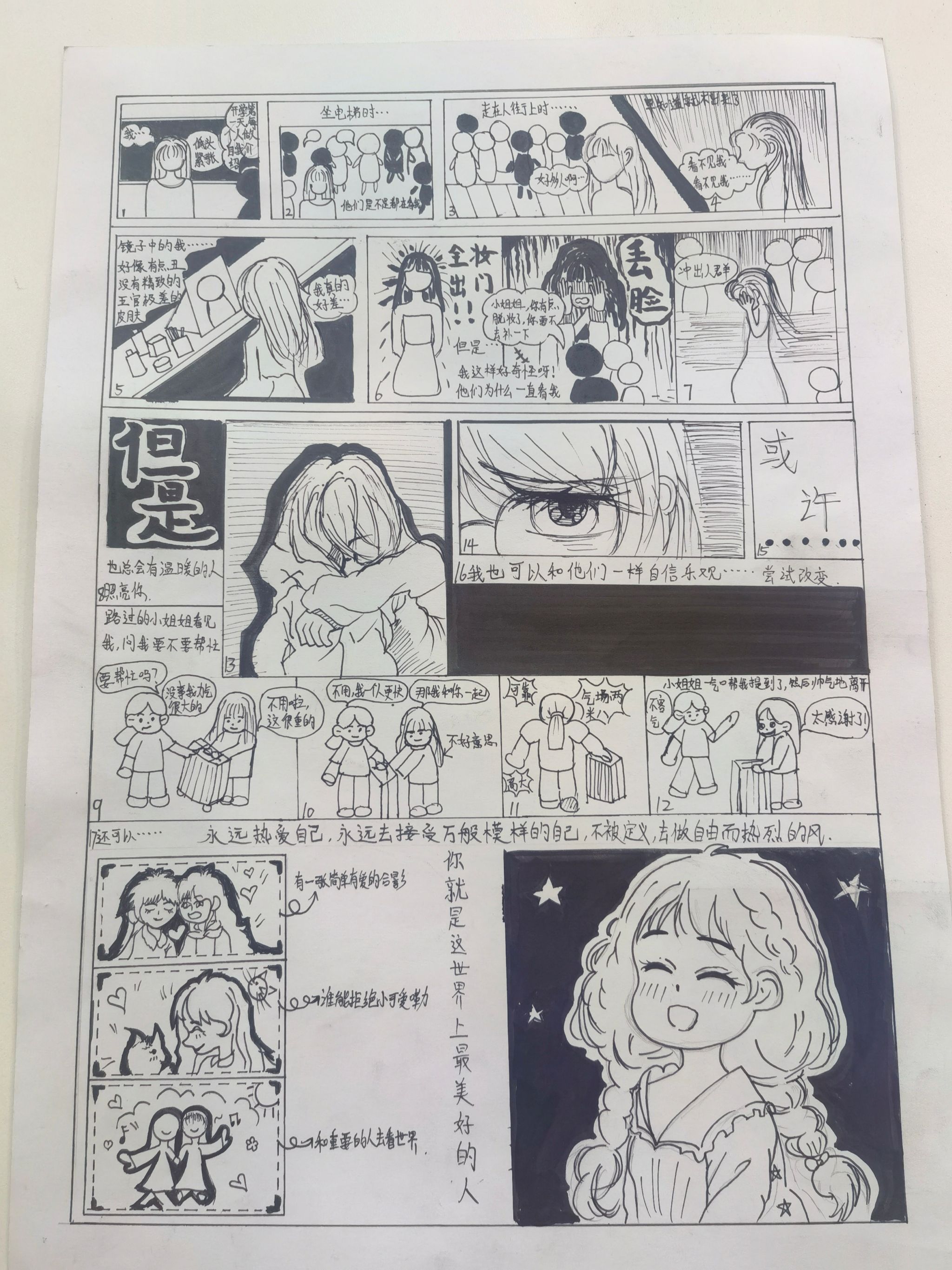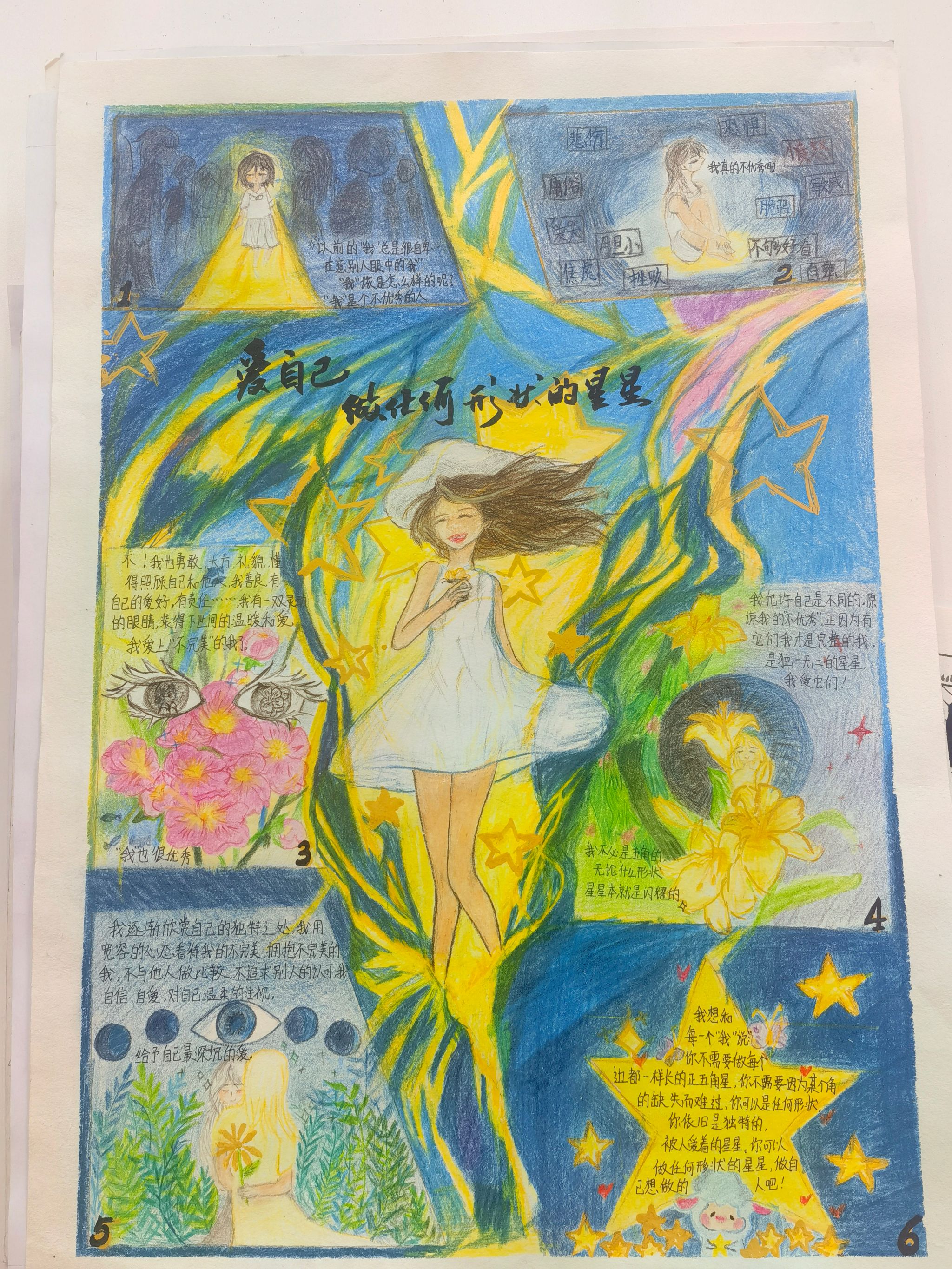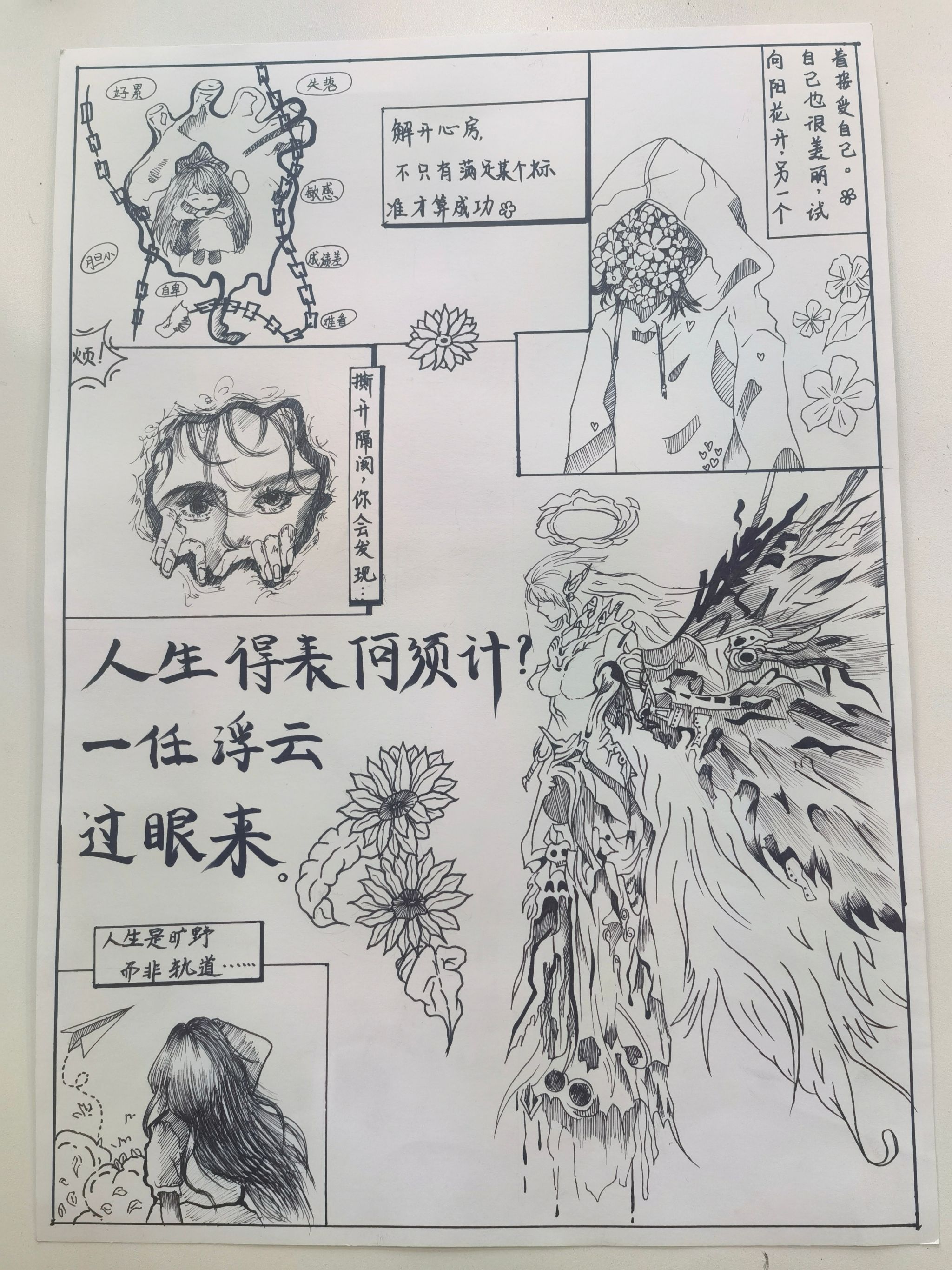 在本届活动期间还开展了“画中有话”心理漫画大赛活动。大赛借助漫画这一生动直观、喜闻乐见的艺术形式,为同学们提供一个表达内心世界、描绘心灵故事、传递积极能量的创意平台。鼓励同学们用画笔聚焦大学生活中的情绪体验、心理困惑、成长感悟、人际互动、生命意义等主题,通过艺术创作实现自我探索、情感宣泄、压力缓解和正向引导。经过二级学院初选,推荐了31副题材丰富多样,风格各异的作品,既有对学业压力、社交焦虑等常见困扰的化解与反思,也有对自我认知、梦想追逐的心灵独白,以及对生命韧性、积极心态的自我理解。同学们用细腻的笔触、巧妙的构思和色彩,将抽象的心理状态具象化,生动的漫画如同心灵的镜子,引发观众的共鸣与深入思考。经过教师评委和学生评委的评选,作品《最好的我》、《爱自己,做任何形状的星星》获得一等奖、《取悦自己》等四幅作品获得二等奖、《向阳而生 我心灿烂》等六幅作品获得三等奖、《花繁域心》等十幅作品获得优秀奖。同学们用画笔讲述自己的心理故事,不仅是一种艺术的表达,更是一种积极的自我疗愈和成长过程。这些作品生动展现了同学们积极向上的精神风貌和关注心灵健康的良好意识。在艺术创作与心灵探索中收获更阳光、更强大的自己。